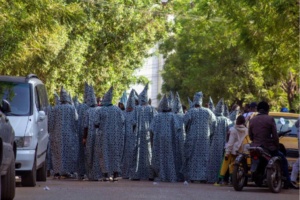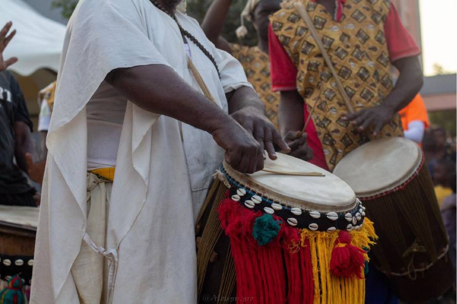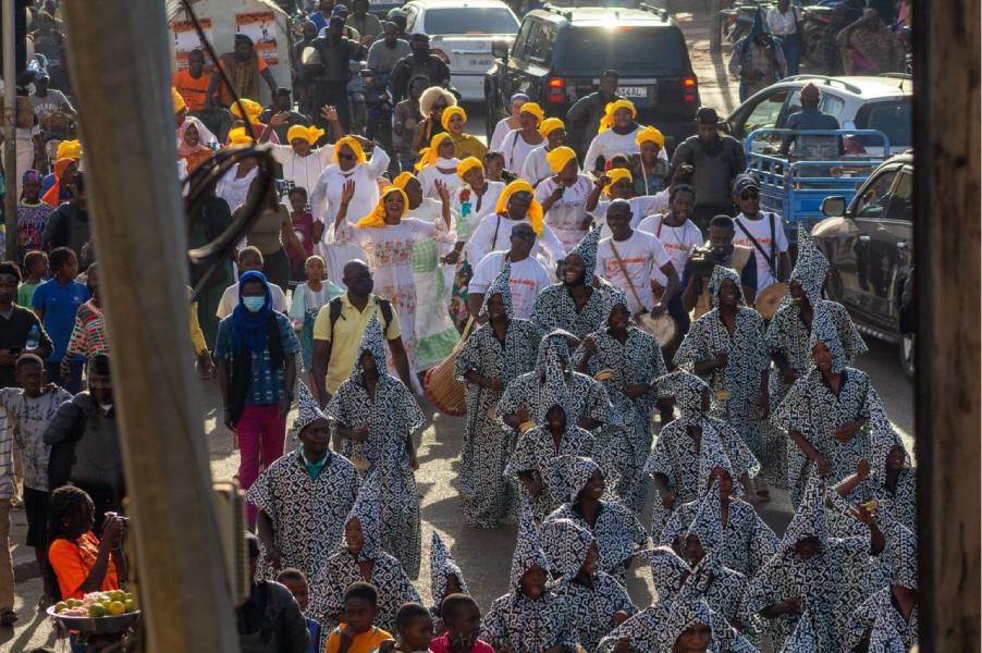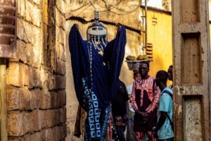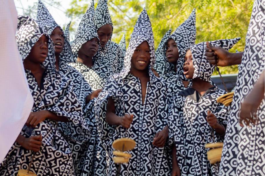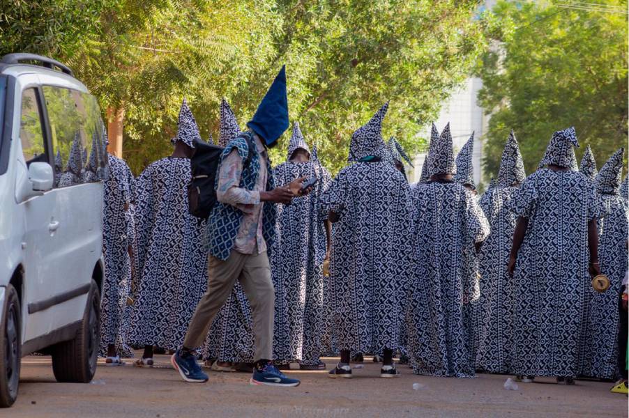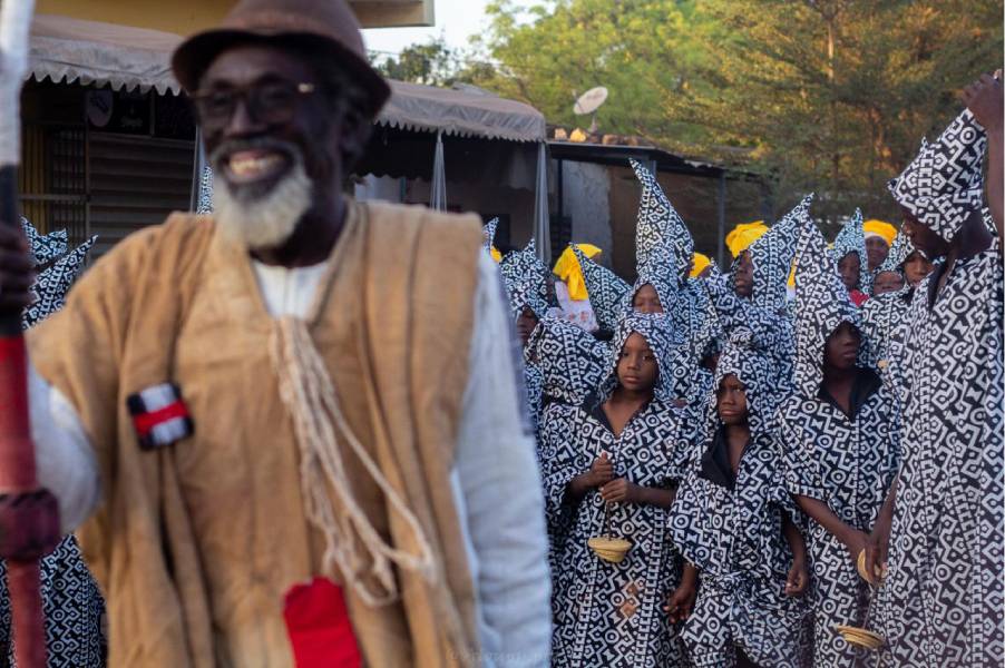 Au milieu du cortège, les silhouettes en costumes graphiques avancent en cadence, guidées par le rythme sourd des percussions. Les femmes en blanc et jaune ouvrent la route avec une grâce tranquille, leurs foulards vibrant comme des étendards de fête. Les enfants observent, imitent, participent. La rue avance, respire, se raconte. Ce que l’on voit ici n’est pas un folklore figé : c’est une tradition vivante, réinventée, rendue au présent.